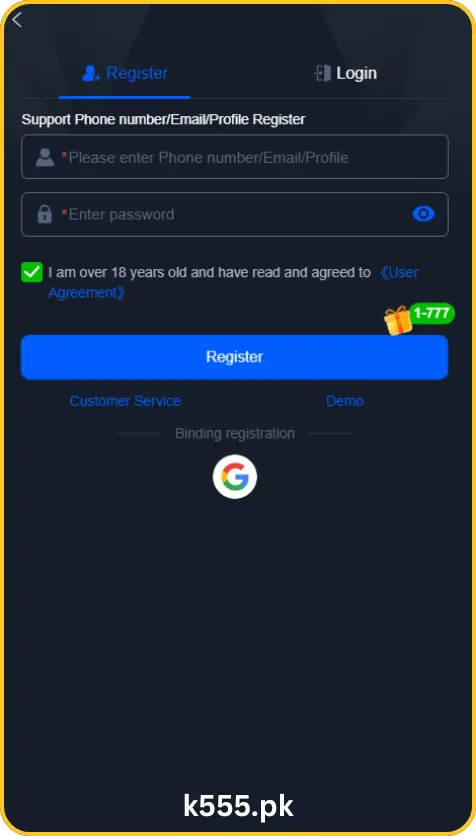 Registration/ Sign in/ Sign up in K55 Game App